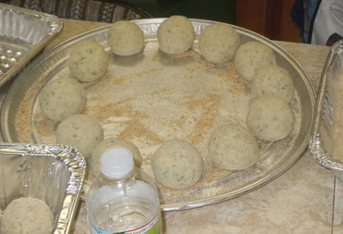 The Holy Rosary Rice balls are about the size of a tennis balls – I’ve seen them golf or Ping-Pong ball size. Basically there’s the rice, the filling, the bread crumb covering and the deep frying. The fillings seem available on various versions – some recopies call for parmesan fillings. Holy Rosary the fillings are ground beef and peas, which seems the most common and the cheese, Romano, is mixed with the rice, as are eggs, making the rice itself creamy.