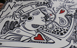 Eva Moll has green eyes and dark blonde hair and a boundless enthusiasm about art and ideas and the ideas her art conveys. She’s very pretty and fun to photograph. Her work combines illustrative influences in a pop art sensibility. It has a radiance, the lines and colors seem to undulate. She combines pop art motifs from diverse decades. What if Keith Haring led a munity on the Yellow Submarine (Peter Max was one of her teachers) when Warhol wasn’t looking.